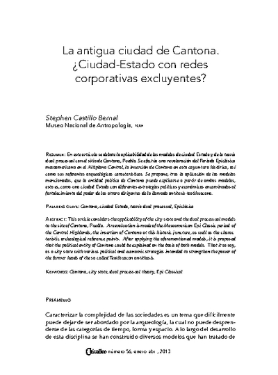 En este artículo se debate la aplicabilidad de los modelos de ciudad-Estado y de la teoría dual-procesual con el sitio de Cantona, Puebla. Se efectúa una revaloración del Periodo Epiclásico mesoamericano en el Altiplano Central, la inserción de Cantona en esta coyuntura histórica, así como sus referentes arqueológicos característicos. Se propone, tras la aplicación de los modelos mencionados, que la entidad política de Cantona puede explicarse a partir de ambos modelos, esto es, como una ciudad-Estado con diferentes estrategias políticas y económicas encaminadas al fortalecimiento del poder de los otrora dirigentes de la llamada antítesis teotihuacana.