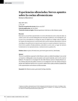 - Este texto es una primera aproximación a la cocina afromexicana como campo de saber; se realizó a partir de la revisión bibliográfica de materiales académicos y de investigación, por lo que no es el resultado de un trabajo de campo. El objetivo es indagar sobre el papel de las mujeres afromexicanas en la conformación de la cocina mexicana, pensando en cómo se reconfiguran las políticas de la memoria para insertar en nuestro presente la herencia cu-linaria de los pueblos afrodescendientes, entendida la cocina como un lugar de memoria fundamental en las representaciones y resistencia de los pueblos afro.