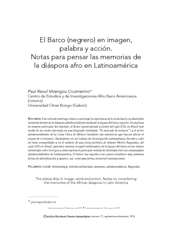 - Este artículo interroga cómo se construye la experiencia de la esclavitud y su dimensión memorial dentro de la diáspora afrodescendiente mediante la figura del barco negrero. Se analizan de manera particular dos intentos, el de un viajero alemán y pintor del siglo XIX, en Brasil (por medio de su visión plasmada en una litografía intitulada “El mercado de esclavos”) y el de los afrodescendientes de la Costa Chica de México (mediante sus narrativas que buscan ubicar el origen de sí mismos). Basándonos en un trabajo de investigación antropológica llevado a cabo en estas comunidades y en el análisis de una pieza pictórica de Johann Moritz Rugendas, del siglo XIX en Brasil, quisimos mostrar el papel emblemático de la figura del barco en los relatosmemoriales sobre el origen y cómo expresa el particular sentido de identidad entre las comunidades afrodescendientes de Latinoamérica. El barco (sea negrero o no) parece establecer una poderosa forma de identificación y aparece, así, como una forma memorial transnacional.