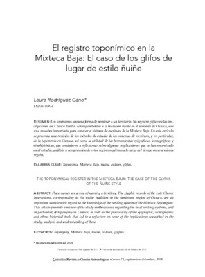 - Place names are a way of naming a territory. The glyphic records of the Late Classic inscriptions, corresponding to the ñuiñe tradition in the northwest region of Oaxaca, are an important sample with regard to the knowledge of the writing system of the Mixteca Baja region. This article presents a review of the study methods used regarding the local writing systems, and in particular, of toponymy in Oaxaca, as well as the practicality of the epigraphic, iconographic and ethno historical tools that led to a reflection on some of the implications unearthed in the study, analysis and understanding of these