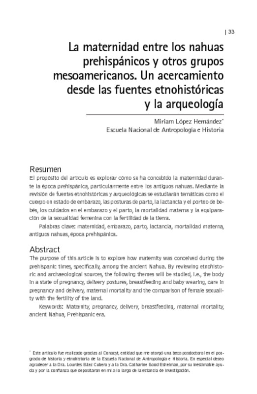 - El propósito del artículo es explorar cómo se ha concebido la maternidad durante la época prehispánica, particularmente entre los antiguos nahuas. Mediante la revisión de fuentes etnohistóricas y arqueológicas se estudiarán temáticas como el cuerpo en estado de embarazo, las posturas de parto, la lactancia y el porteo de bebés, los cuidados en el embarazo y el parto, la mortalidad materna y la equiparación de la sexualidad femenina con la fertilidad de la tierra.