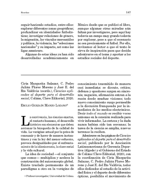 - URL Ciria Margarita Salazar, C. Pedro Julián Flores Moreno y José E. del Río Valdivia (coords.), Ciencias aplicadas al deporte para el desarrollo social, Colima, Clave Editorial, 2020. Nueva Antropología Vol. 34 Núm. 94 (2021)