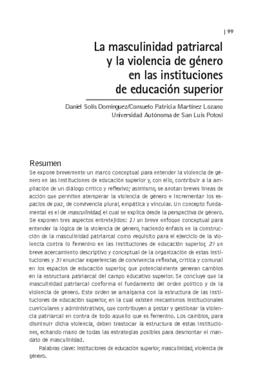 - In this article a brief conceptual framework is exposed in order to understand the gender violence carried out within higher education institutions. In addition, the purpose is contribute in the elaboration of a critical and reflective dialogue. On the other hand, a brief lines of action are considered, which allow to temper gender violence and to increase spaces for peace, as well as plural and sympathetic coexistence. A fundamental concept is “masculinity”, explained from a gender perspective. Three interrelated aspects are exposed: a) a brief conceptual approach to understand the logic of gender violence, emphasizing the construction of patriarchal masculinity as a requirement for the exercise of violence against the feminine in higher education institutions. b) a brief descriptive and conceptual approach of how these institutions are organized. c) take into consideration experiences of reflective, critical and communal coexistence in higher education spaces, which, potentially, generate changes in the patriarchal structure of the higher educational field. It is concluded that the patriarchal masculinity is the base of political order and gender violence. This order is amalgamated with the structure of higher education institutions. Within this institutions, there are curricular and administrative institutional mechanisms that contribute to develop and negotiate the patriarchal violence against everything that is feminine. The changes to reduce this gender violence, must disrupt the structures of higher education institutions, taking advantage of all possible strategies to eradicate the mandate of masculinity.