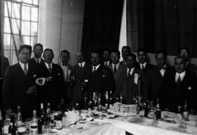 "Congresistas de caminos en la cervecería modelo", retrato de grupo