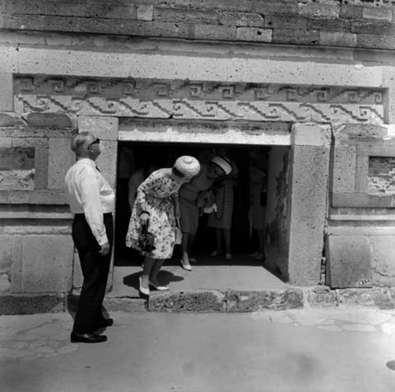 - Juliana, reina de Holanda, Beatriz, princesa de Holanda acompañados de su comitiva en el Templo de las Columnas en Mitla.