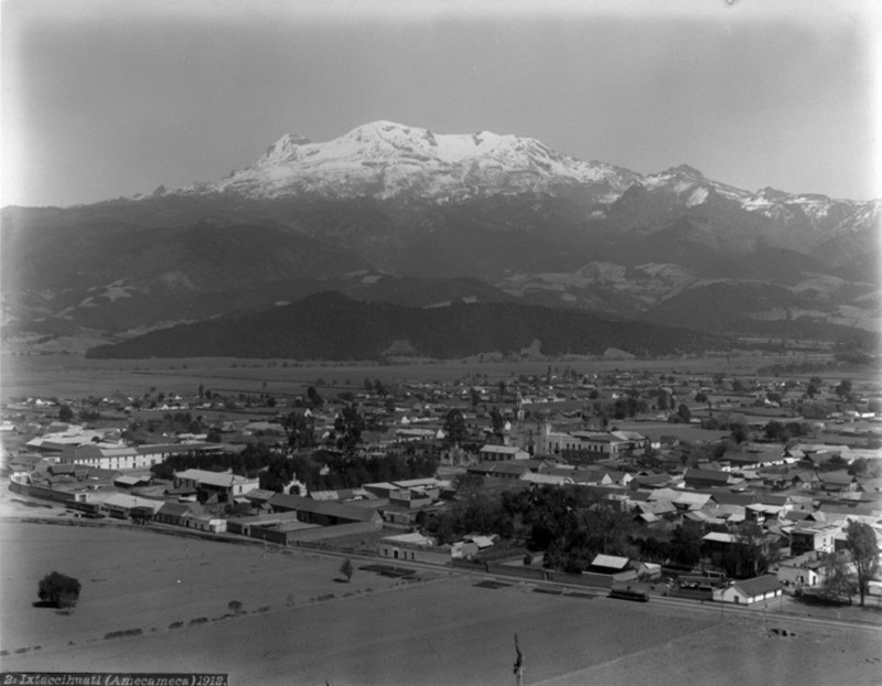 Poblado de "Amecameca", al fondo el "Iztaccihuatl", paisaje