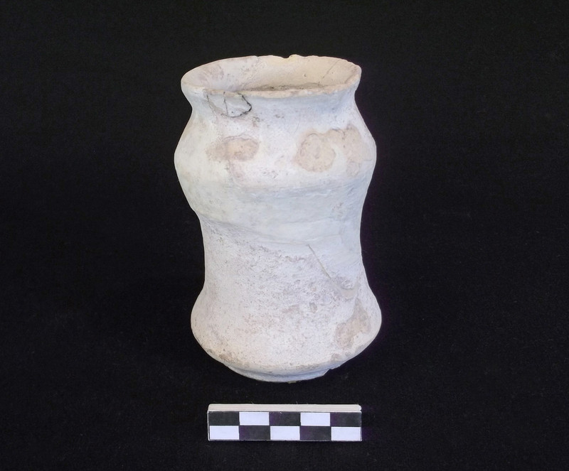 - Albarelo de base anular, cuerpo de silueta compuesta, cuello curvo divergente y borde biselado. Elaborado en pasta crema vidriada.
