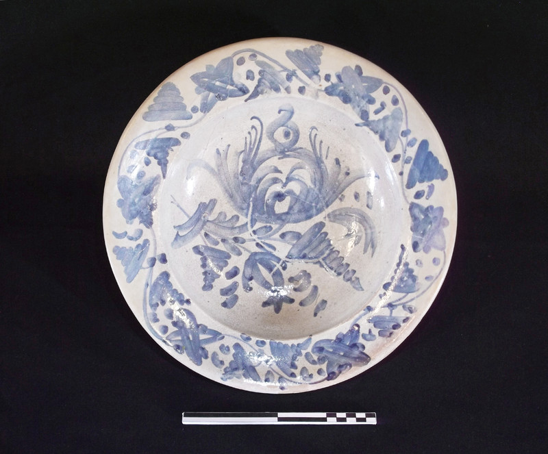- Base anular, pared curvo convergente, borde evertido de labio redondeado. Elaborado con decoración interior bicroma azul sobre blanco que representan motivos florales.