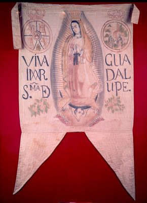 Estandarte de la Virgen de Guadalupe. Elaborado en tela de algodón. Muestra en campo la imagen de la Virgen de Guadalupe, pintada al óleo, se observan dos escudos coronados en ambos lados flanqueando a la virgen. Uno muestra el escudo de armas español, con elementos de León y Castilla. En el segundo muestra en primer plano a dos santos, San Pedro y San Pablo, en segundo plano una iglesia y tres montículos. Debajo de estos la siguiente inscripción y monograma de la virgen guadalupano cuyo significado es el siguiente: "Viva María Santísima de Guadalupe". Se observan dos ramos de flores que flanquean al querubín que se encuentra a los pies de la virgen. Pieza restaurada que cuenta con soporte de lino y una maya de seda que cubre la pintura. La parte superior del estandarte cuenta con una jareta donde entraba la vara y dos listones en cada extremo que la sujetaban.