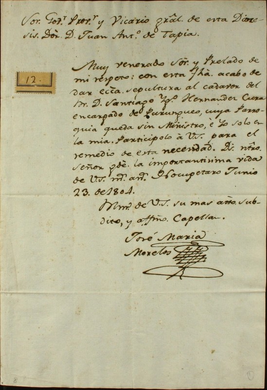 - Aviso al Sr. Gobernador, Provisor y Vicario General de la diócesis, Don Juan Antonio de Tapia de la muerte del cura de Purungueo