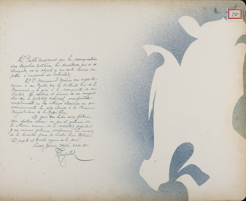- "El pueblo mexicano que ha reconquistado sus derechos políticos, ha demostrado que si es abnegado, no es abyecto y que sabe hacerse respetar e imponer su voluntad. El C. Francisco I. Madero que supo iluminar a ese pueblo con la brillante luz de la Democracia y lo guió a la reconquista de su libertad, ha recibido el premio de su magna obra con la gratitud nacional manifestada ampliamente en las últimas elecciones, en que unánimemente ha sido elevado a la Primera Magistratura de la República. La paz que había sido ficticia, sea efectiva ahora, en que el gobierno de la Nación emana de las voluntad popular y ese mismo gobierno confirmarla la verdad de la hermosa frase de nuestro Gran Patricio: "El respeto al derecho ajeno es la paz". Ciudad Juárez, Octubre 22 de 1911. N. Arguelles”.