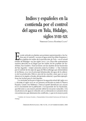 - This article is a first approach to the study of the fights for access and control of water between the regional elites and the Indian towns in the jurisdiction of Tula during the XVIII and XIX centuries. A fight that had its roots in the new regional economic outlook created by the reduction of cattle ranching. Around the XVIII century, the regional economy turned towards the cultivation of grains, but without completely leaving aside the raising of cattle for slaughter. In that context, the regional elites, old cattle ranchers, invested important amounts in the construction of hydraulic infrastructure directed to the irrigation of fields. However, it was the Indian towns who had traditionally controlled an important part of the available water, and therefore a confrontation was inevitable.