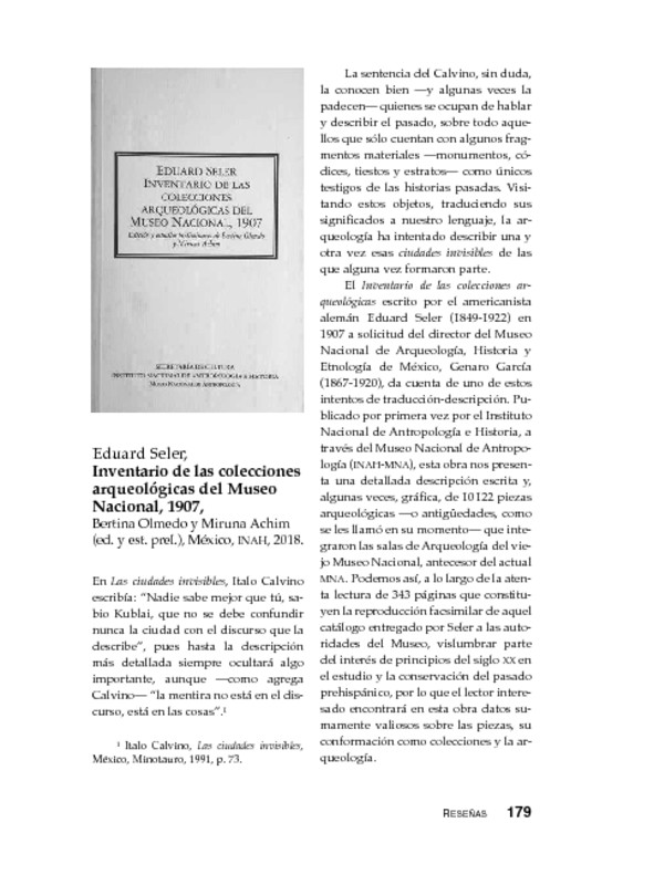 - El Inventario de las colecciones arqueológicas escrito por el americanista alemán Eduard Seler (1849-1922) en 1907 a solicitud del director del Museo Nacional de Arqueología, Historia y Etnología de México, Genaro García (1867-1920), da cuenta de uno de estos intentos de traducción-descripción. Publicado por primera vez por el Instituto Nacional de Antropología e Historia, a través del Museo Nacional de Antropología (INAH-MNA), esta obra nos presenta una detallada descripción escrita y, algunas veces, gráfica, de 10 122 piezas arqueológicas —o antigüedades, como se les llamó en su momento— que integraron las salas de Arqueología del viejo Museo Nacional, antecesor del actual MNA.