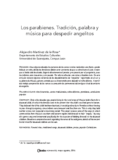 Only a few decades ago, people living in the rural areas of Mexico held a fiesta for a deceased child, in which the families were to be content that the child’s soul had gone to heaven. They believed that if the child had been baptized, it would go directly to Paradise without having to pass through purgatory, since infants were innocent and free from sin. This is why they held neither a mass nor respected a mourning period. This paper reviews some of the ways in which communities from Mexico’s southern and eastern regions bid farewell to their “angels,” by way of a genre sung and interpreted specifically for the occasion of bidding farewell to the deceased children. Based on a comparative work regarding the verses of the said genre, details of the ancient burial ritual for deceased children can be seen