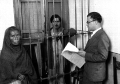 Lectura del expediente a un procesado en presencia de un miembro de su familia ambos de aspecto humilde