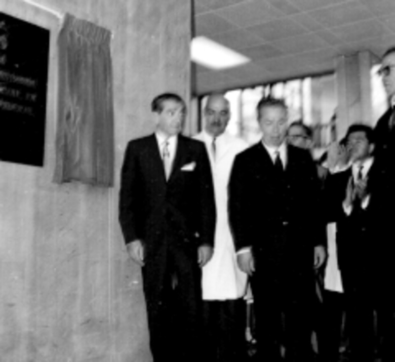 Adolfo López Mateos develando placa inaugural de la clínica del IMSS Unidad Revolución