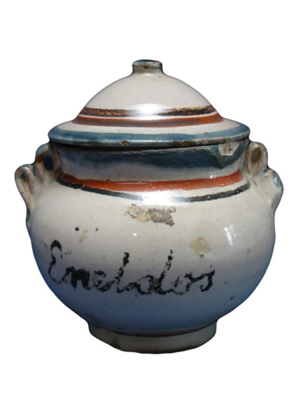 - Vasija esmaltada, tipo loza de Puebla, decorada en el contorno superior, cuello, borde de la boca y tapa con líneas color azul, café y rojo sobre fondo blanco. En los costados se aprecian dos pequeñas orejas dobles para su mejor manejo. Tiene en el centro del cuerpo la inscripción "Eneldos" ya que precisamente esa era la sustancia que contenía en la botica en que se utilizaba.