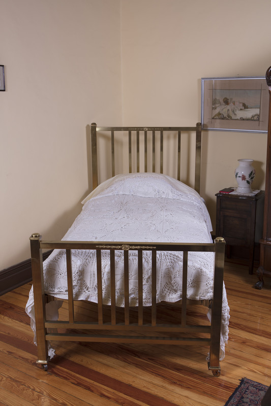 - Cama individual de latón marca Simmons Company. Hecho en Kenosha, Wisconsin (EE.UU.). Tambor metálico. Laminado, perforado, templado, vaciado, unión por soldadura, remachado por calor. Se considera que perteneció a Julia Carranza Salinas.