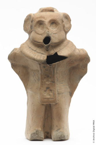 - FIGURILLA ANTROPOZOOMORFA, HUECA, LADO ANTERIOR MOLDEADO, POSTERIOR MODELADO. PERSONAJE DE PIE, PIERNAS LIGERAMENTE SEPARADAS, BRAZOS ABIERTOS A LOS LADOS INCOMPLETOS, CABEZA CUBIERTA POR UNA MÁSCARA DE AVE, POSIBLE BÚHO. ATAVIADO CON CINTURÓN Y FAJERO CON ROMBOS, CAPA, GRAN BANDA VERTICAL, CON 3 CRUCES, QUE ATRAVIESA EL TORSO Y OCULTA EL SEXO, PECHERA SEMICIRCULAR CON FLECOS CORTOS.