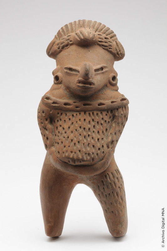 FIGURILLA SÓLIDA ANTROPOMORFA DE SEXO INDEFINIDO DE UN PERSONAJE DE PIE, CON LAS PIERNAS SEPARADAS Y CON LAS MANOS UNIDAS SE SOSTIENE UN VIENTRE ABULTADO, EL CABELLO PEINADO HACIA ATRAS Y TIENE UN TOCADO DE BANDA FRONTAL. LA NARIZ PROMINENTE, LOS OJOS RASGADOS OBLICUOS Y LA BOCA SEMIABIERTA MOSTRANDO LOS DIENTES. PORTA OREJERAS DISCOIDALES Y UNA BANDA EN EL PECHO. PRESENTA TODO EL CUERPO, LOS BRAZOS Y LA PIERNA IZQUIERDA CON CONTINUAS PUNZÓNADAS.