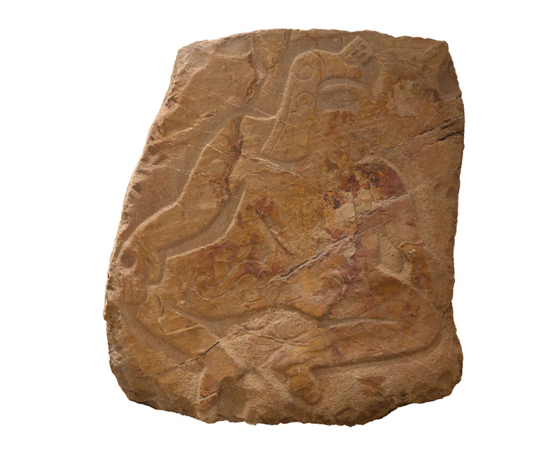 - Danzante monolítico irregular, representación antropomorfa, personaje en cuclillas, piernas flexionadas a los costados con mutilación de genitales, representado con la voluta de sangre o flor, los brazos flexionados y manos sobre las rodillas, tronco recto y cabeza de perfil.
